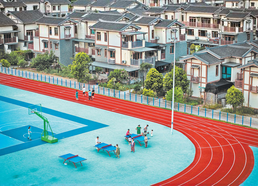 8月6日傍晚,九龍坡區銅罐驛鎮,新近建成投用的美麗鄉村民居運動場,居民們正在休閑、運動。 該運動場由垃圾場改造而成,占地3672平方米,含籃球場、羽毛球場、乒乓球臺及塑膠跑道等,惠及1650戶村民?!?/p>