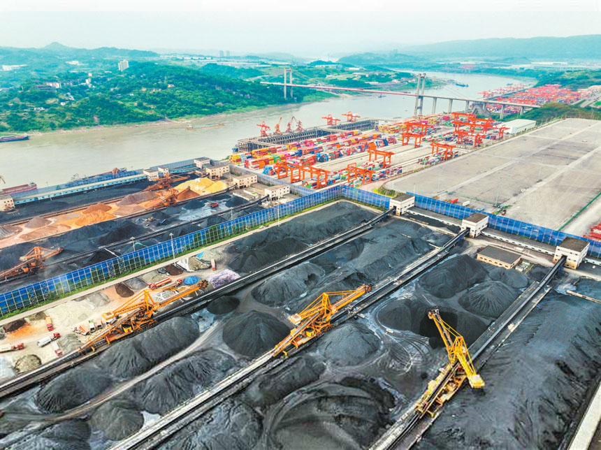 8月6日,重慶果園港散貨堆場,多臺斗輪煤炭轉車機正在高效運轉。(無人機圖片) 當日,滿載陜煤的貨運列車抵達重慶果園港?!?/p>
