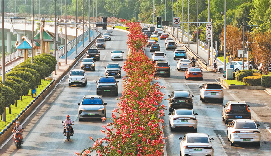 8月4日,沙濱路,迎著盛夏高溫綻放的紫薇花給山城街頭帶來幾分熱烈浪漫色彩。 持續高溫擋不住紫薇花開放的腳步?!?/p>