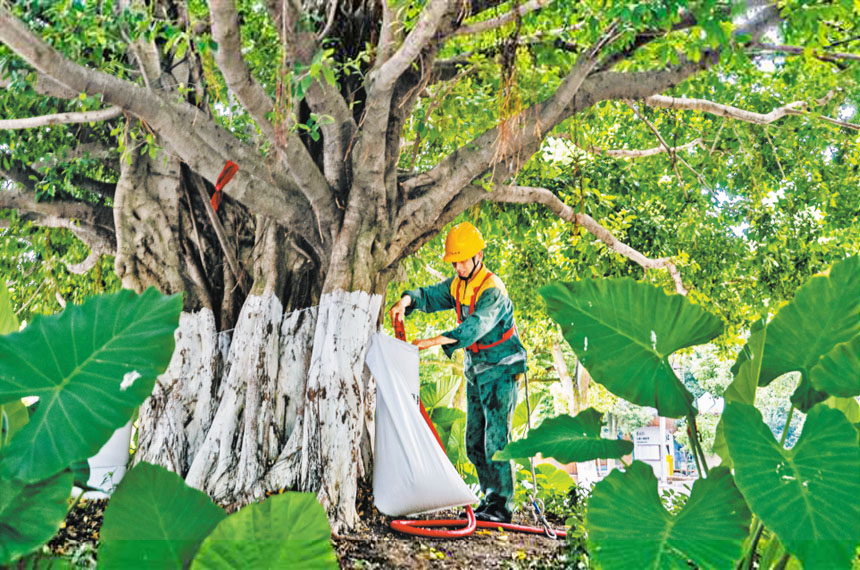 8月6日,兩江新區照母山森林公園,綠化工人在給古樹的滴灌袋里注水。 連日來,兩江新區照母山森林公園60名綠化工人頂著高溫,守護270萬平方米植被?!?/p>