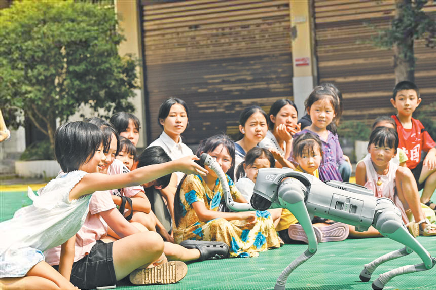 8月6日,酉陽縣楠木鄉紅莊村,孩子們與智能機器狗互動。 暑假期間,紅莊村駐村工作隊開辦“學科技、度暑假”科技興趣培訓班,為鄉村兒童普及科技知識,讓孩子們和智能機器狗親密接觸,零距離體驗智能科技的魅力?!?/p>