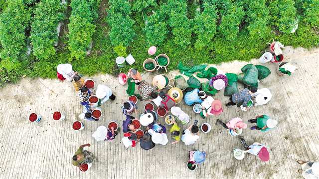8月22日,酉陽縣涂市鎮涂市村,村民在辣椒產業種植基地采收辣椒(無人機照片)。 近年來,酉陽縣涂市鎮結合當地土壤、氣候等實際條件,因地制宜引導村民發展辣椒、可食甜玉米和高山反季節蔬菜等特色產業,帶動村民在家門口就業增收?!?/p>