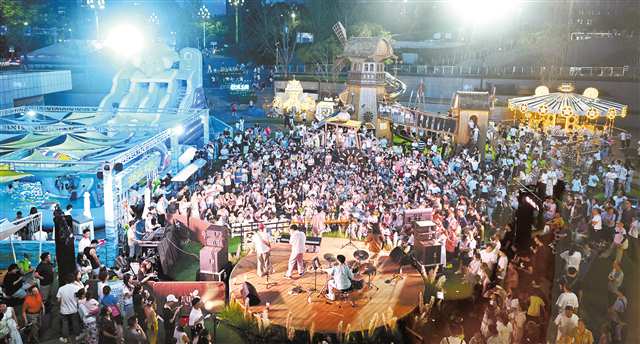 8月22日,渝北區龍湖重慶公園天街A館1號門外,一場戶外沉浸式音樂會吸引眾多市民。 當晚,現場人氣火爆,圓形舞臺設計帶給觀眾沉浸式體驗,經典歌曲接連響起,引發全場大合唱,觀眾或跟唱或歡呼,氣氛熱烈?!?/p>