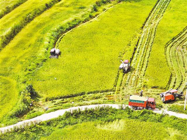 8月23日,梁平區禮讓鎮新華村,收割機在稻田中收割稻谷(無人機照片)。 當日是處暑節氣,我市各地積極搶抓晴好天氣開展水稻收割,田間地頭處處是繁忙景象?!?/p>