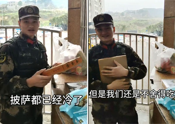 一份披薩、一只烤雞、一包沙琪瑪、幾杯熱飲……尤其是袋子里有一張紙條寫著:“世界上哪有什么歲月靜好,只是有你們的負重前行,給你們點贊!”簡單的禮物配上配上真摯的話語,讓李林和他的戰友們看到之后熱流涌動。