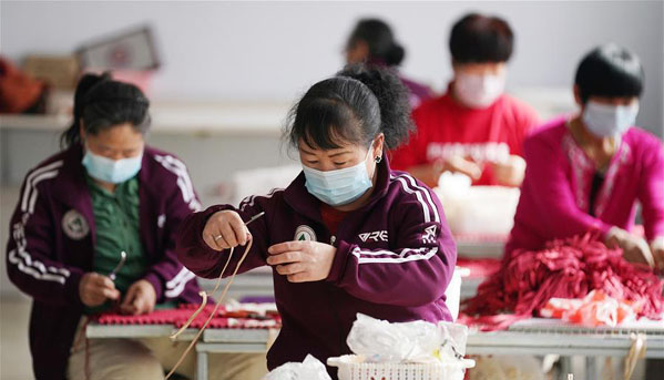 4月8日,在泰來縣平洋鎮雙山村扶貧車間,女工們在編織汽車坐墊。 眼下,黑龍江省泰來縣已復工復產的扶貧車間正開足馬力,趕制產品訂單。去年以來,泰來縣扶持各鄉鎮把汽車坐墊編織等扶貧車間建立在村屯,依托縣里引進的龍頭企業帶動,讓群眾在家門口實現就業增收。截至目前,全縣已建立27個扶貧車間,帶動1200余人就業增收,其中貧困群眾200余人。 新華社記者 王建威 攝