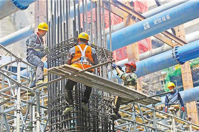 4月9日,工人正在軌道交通9號線最大站點——富華路站緊張施工。