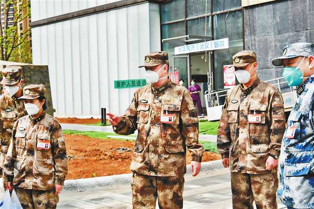 吳昊(左三)正在武漢泰康同濟醫院檢查患者收治準備工作。(陸軍軍醫大學第二附屬醫院)