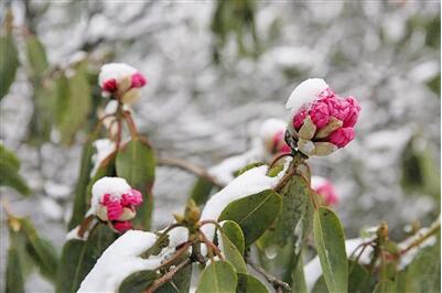 在銀廠坪景點,受前幾天的氣溫回升影響,萬畝野生杜鵑花較往年提前半個月左右開放。晚間一場降雪,給這些鮮艷的杜鵑花鑲上了一圈碎鉆,晶瑩剔透。春花、雪花,同在一景,煞是好看。