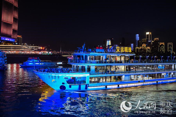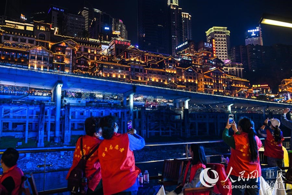 疫情防控一線工作者乘坐交運兩江游船觀賞重慶夜景。鄒樂 攝