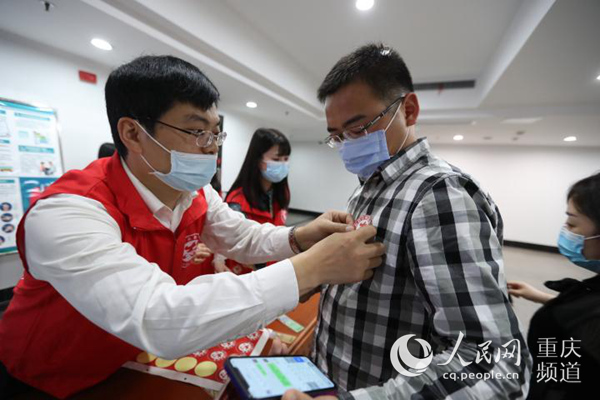 用餐者佩戴上志愿胸貼。譚鑫 攝