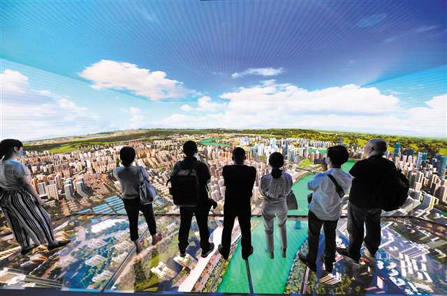 五月六日,江北區江北嘴,市民在成渝地區雙城經濟圈江北區形象展示中心浸入式影院“鳥瞰”兩地風貌。首席記者 崔力 攝