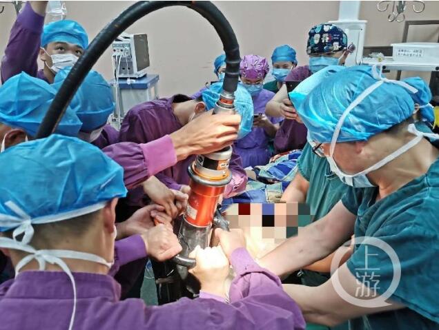 “考慮到第一種方案對患者損傷較大,決定采取第二種方案!弊T云說,雖然鋼筋在工地已經被截斷,但還是留下不少,并且鋼筋為螺紋鋼,如果按正常的方式抽出,會帶出部分體內組織,對患者造成更大的傷害,為了最大限度減少患者損傷,也方便操作,決定求助消防用專業工具剪切。
