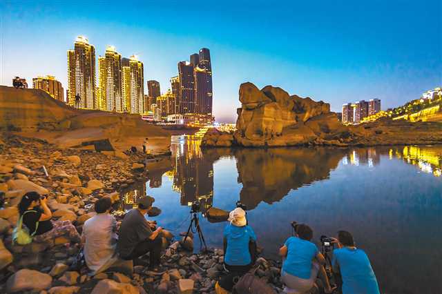 5月8日,南岸區龍門浩,由于長江枯水期水位下降較多,一塊形似烏龜的巨石露出江面,吸引了不少市民和攝影愛好者。記者 龍帆 攝