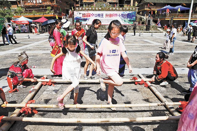 6月25日,黔江區小南海鎮土家十三寨,小朋友學跳竹竿舞。特約攝影 楊敏/視覺重慶