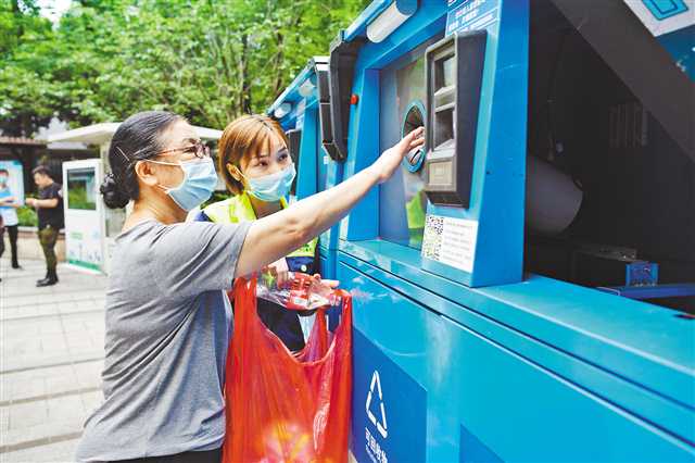 8∶58 分類投放。7月3日,鋼球小區居民婁碧華(左)把塑料瓶放入可回收物智能投放箱。記者 郭曉靜 崔曜 攝/視覺重慶