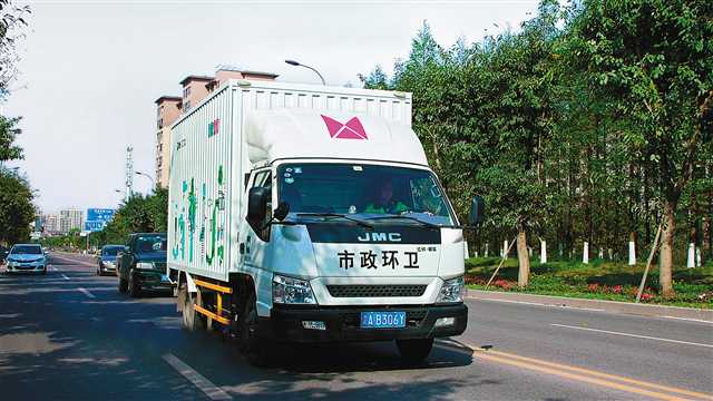 11∶47 回收轉運。收運車離開鋼球小區,返回陳庹路中轉站分選中心。(市環衛集團供圖)