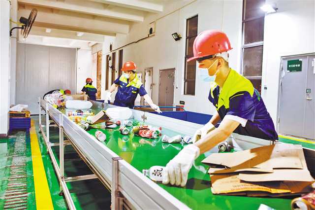 記者看到,分選中心的工人戴著口罩和手套,先是將一個個塑料袋里的各種可回收垃圾放到傳送帶上,然后傳送到分揀作業區,工人分別揀出塑料飲料瓶、金屬易拉罐、廢紙板、紡織物等,放到身邊的藍色回收箱內。