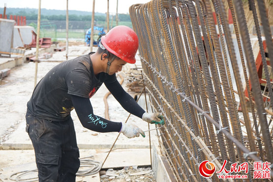 工人正在用鋼筋綁扎箱梁。羅列 攝