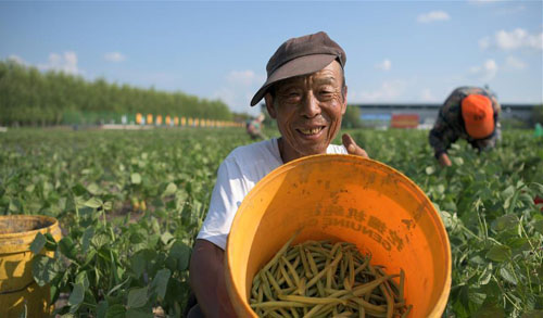 7月14日,在克東縣昌盛鄉青刀豆蔬菜種植示范基地,昌盛鄉安全村脫貧戶丁紹興展示剛摘下的青刀豆。 黑龍江省克東縣地處大興安嶺南麓,近年來,當地大力發展扶貧產業,探索“小院經濟”、訂單種植和加工產業相融合新方式,帶動農民就業和脫貧增收。 新華社記者 王建威 攝