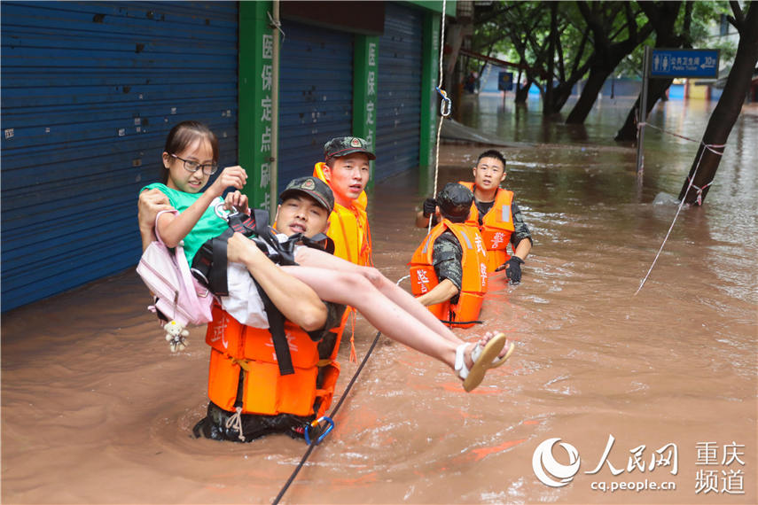 武警官兵正組織轉移受困群眾。鄒毅攝
