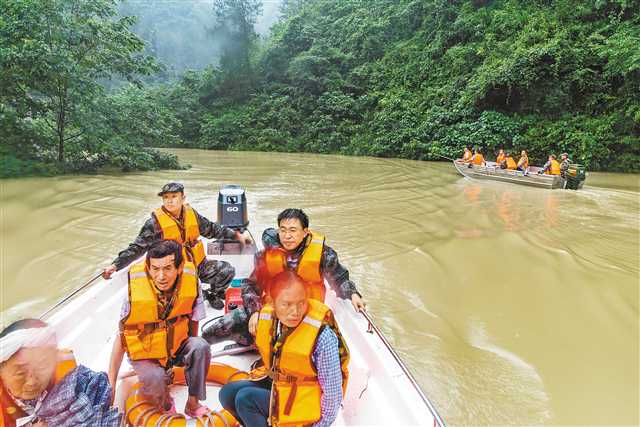 豐都 豐都縣暨龍鎮烏羊壩,縣民兵應急連組織兩艘沖鋒舟救援被洪水圍困的群眾。通訊員 林登周 攝/視覺重慶