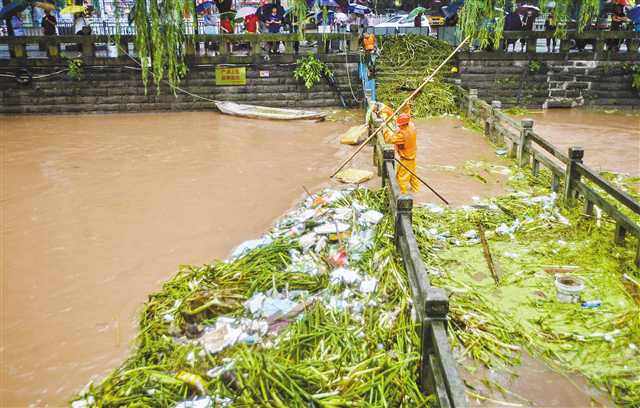 榮昌 榮昌區池水河,搶險人員正在清理河中的雜物垃圾,保證橋梁的安全。記者 龍帆 攝/視覺重慶