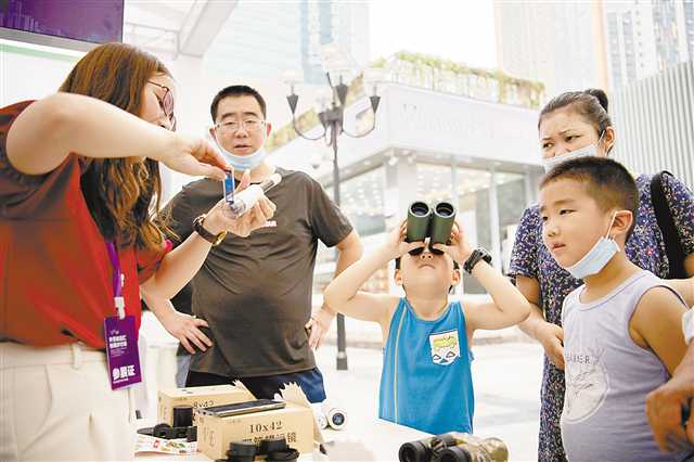 七月二十五日,解放碑步行街,“外貿優品匯 扮靚步行街”活動現場,市民帶著孩子體驗商家展出的望遠鏡。記者 謝智強 攝\視覺重慶