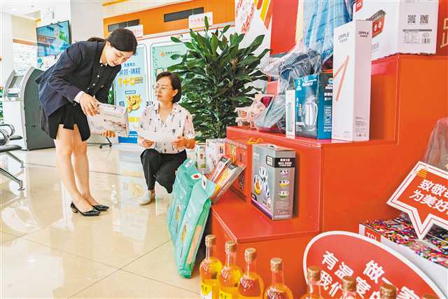 七月二十七日,巴南區龍洲灣街道龍海社區成都銀行巴南支行,李自玲(右一)查看社區道德積分銀行七月兌換情況。首席記者 崔力 攝\視覺重慶
