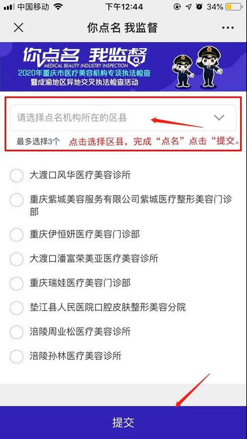 關注“重慶衛生健康衛士”微信公眾號,點擊底部右下角“公眾互動”板塊的“微活動”欄目,選擇你關心的醫療美容機構進行“點名”,或直接點擊本推送底部左下方的“閱讀原文”進行“點名”。