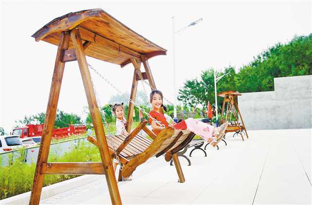 7月30日,孩子們在休閑廣場開心地蕩秋千。
