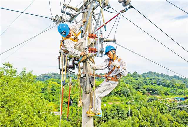 大渡口跳蹬鎮紅勝村,電力工人正在搶修10千伏線路電桿的故障刀閘和引流線。記者 鄭宇 攝/視覺重慶