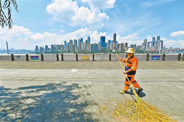 南岸南濱路煙雨公園,環衛工人高溫下清掃樹葉,為城市整潔辛勤勞動。特約攝影 郭旭/視覺重慶