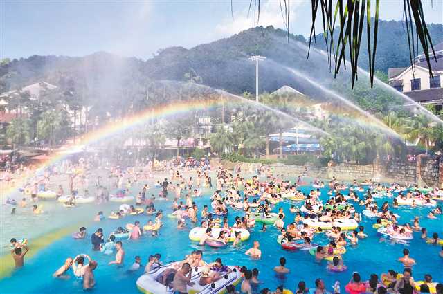 8月4日,重慶海昌加勒比海水世界景區內,市民們在泳池中感受清涼。(重慶海昌加勒比海水世界供圖)