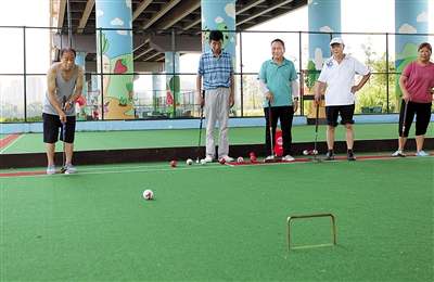 老人們在接龍橋社區體育文化公園里打門球。