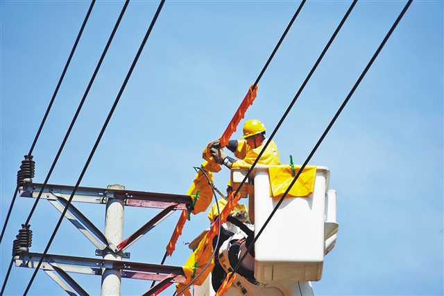 “今天我們開展帶電拆頭作業,A組作業人員如果感覺到身體難受,那就不要硬撐,先下來喝口‘冰可樂’,換B組進行作業……”8月6日早上8點30分,室外氣溫高達36℃,國網重慶市電力公司潼南區供電分公司帶電作業班班長田小平正在對當天的工作任務進行安排。