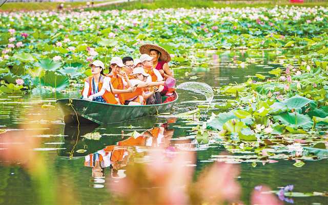 8月13日,武隆區滄溝鄉大田濕地人家鄉村旅游點,游客泛舟荷塘。該景區以“荷”為主題,是一處集觀光、休閑、度假、體驗于一體的綜合性旅游景區。