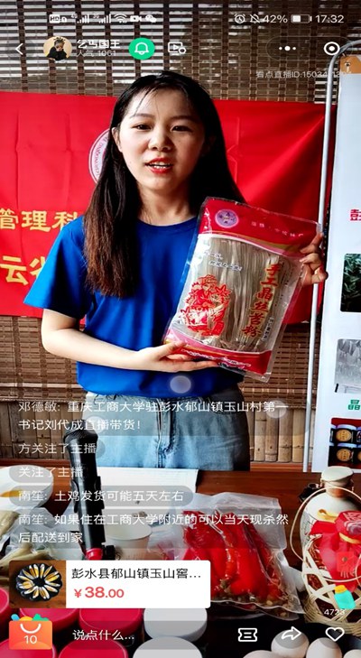 為開展好直播,小云雀服務隊在村委第一書記劉代成的帶領下,走訪了生產晶絲苕粉、土雞、土雞蛋、特色窖藏酸菜、郁山特色辣椒醬等多家農戶,進行產品調研和視頻拍攝。他們運用專業知識,分析產品,提煉產品特色,設計直播腳本和制作前期宣傳視頻。