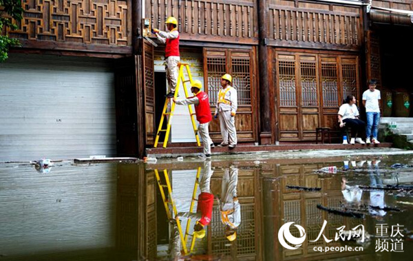 8月19日上午,國網紅巖(合川城區中心)共產黨員服務隊員正在對沿街被淹供電設備逐級安全檢查。國網重慶市電力公司供圖