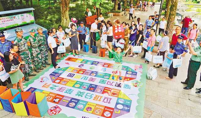 8月17日,江北區寸灘街道金科廊橋水岸,社區居民參加垃圾分類游戲。當日,該區“文明城市共創建,垃圾分類我先行”垃圾分類進社區主題宣傳活動舉行,20多家物業單位工作人員和300多位社區居民在志愿者帶領下學習垃圾分類知識。
