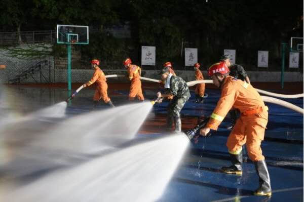 8月22日零點過,在長壽二中,區消防救援支隊的指戰員們與當地武警官兵一起,對操場上的淤泥進行沖刷!敖裉炝璩恐畠缺仨殞⑦@里清掃干凈,確保后期學校順利開展災后恢復工作”,現場消防指戰員焦汝寬表示。