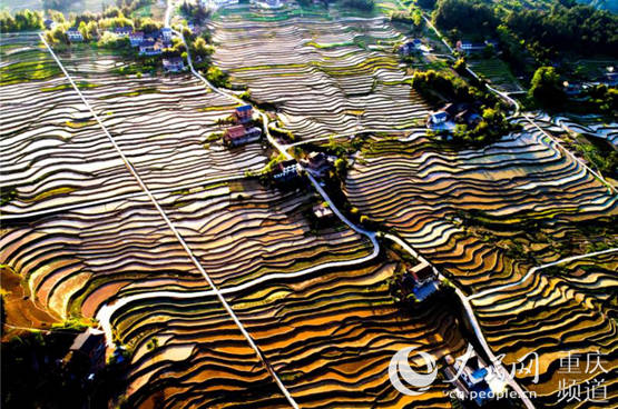 人民網重慶8月24日電 南川區石溪鎮鹽井梯田,稻穗沉甸,像座座金塔頂玉宇。4000余畝梯田集中連片,層層疊疊,形狀各異,在陽光下好似從人間登上天堂的天梯,此景恍如天上人間。