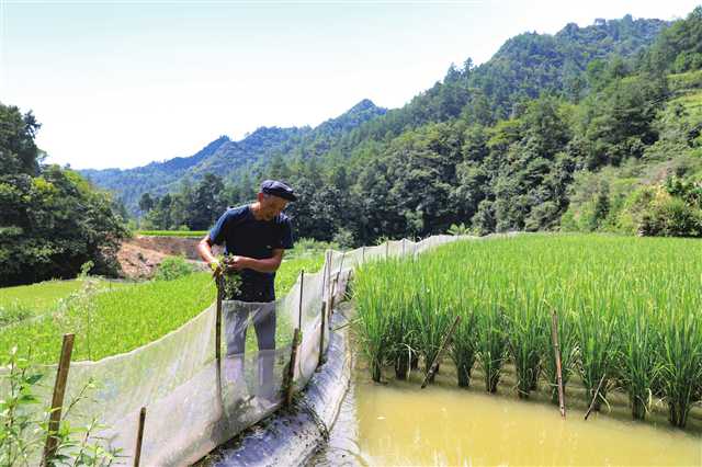 從山上的桑園走到山腳,在金塘村4組脫貧戶黃尤群的稻田里,眼見草魚、鯉魚的喜人生長勢頭,黃尤群笑容滿面!耙郧笆杖胫饕詣辙r為主,來源單一。稻田養魚能夠為我們增加不少經濟收入!秉S尤群算了算:5畝稻田魚里,投放4000尾魚苗,加上5畝稻米的收成,今年預計能收入8萬元。