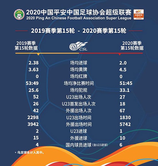 人民網北京10月20日電 中超聯賽第15輪昨晚全部戰罷,本輪場均進球數2.0個,場均黃牌4.5張,8場比賽均沒有出現紅牌,場均犯規33.1次,場均凈比賽時間51分45秒。
