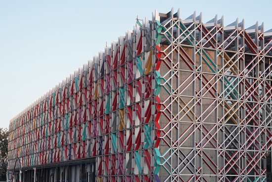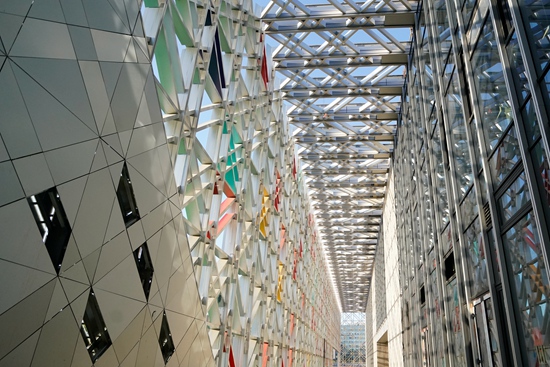 據了解,在幕墻的設計中,設計師還將豐富的色彩應用于 “冰菱花”之中。格柵幕墻由五種顏色組成,通過數字化技術將五種色彩的分布和定位計算出來,并進行精細的編組加工。同時,為了在夜晚呈現各色雪花漫天落下的視覺效果,外幕墻采用暗藏燈具的設計,與幕墻工藝完美結合并隱藏于其中,實現見光不見燈的效果。并通過相關技術,對每個燈具實現精準控制,以形成雪花飄落的動態設計,描繪出夜晚詩一般的意境圖畫。