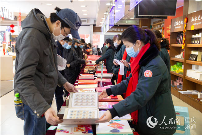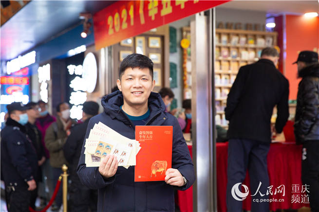 來自浙江的年輕情侶林峰和鄧麗,原本是到解放碑“打卡”游玩,偶然間在解放碑主題郵局看到生肖郵票發行活動,倆人也興奮地排起了長隊!凹依锏母改敢恢倍加袨楹筝吺詹剜]冊、紀念幣的習慣。今天正好遇到這個活動,給家人買一份回去當做新年禮物,表達一下我們晚輩的祝福!编圎愓f道。