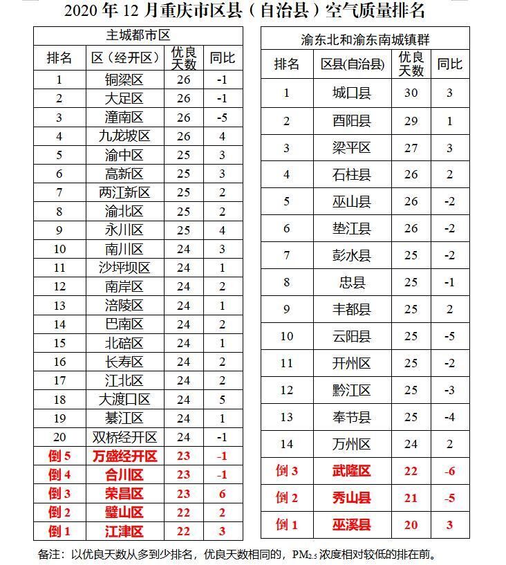 主城都市區,12月,江津區、璧山區、榮昌區、合川區、萬盛經開區空氣質量相對較差(從倒數第1名至倒數第5名),銅梁區、大足區、潼南區、九龍坡區、渝中區空氣質量相對較好(從第1名至第5名)。