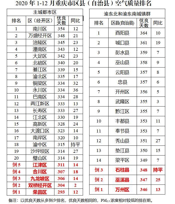 按照《重慶市大氣污染防治條例》第22條規定,今(6)日,重慶市生態環境局發布2020年12月和1-12月重慶市及區縣(自治縣)空氣質量排名通報,去年重慶空氣質量優良天數為333天,再創新高,酉陽以364個優良天數,位列全市之首。