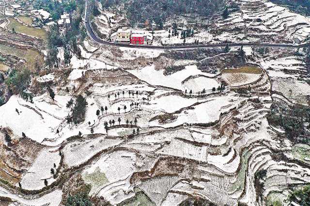 一月七日,白雪覆蓋著黔江區黑溪鎮光明村的梯田和民居。當日,受寒潮氣候的影響,黔江區城鄉普降大雪。特約攝影 楊敏\視覺重慶