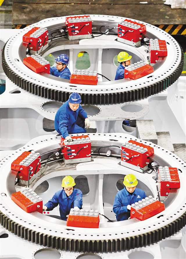 1月8日,位于兩江新區禮嘉的中國船舶集團海裝風電股份有限公司廠房內,技術人員正在抓緊裝配風電機組。記者 羅斌 攝/視覺重慶